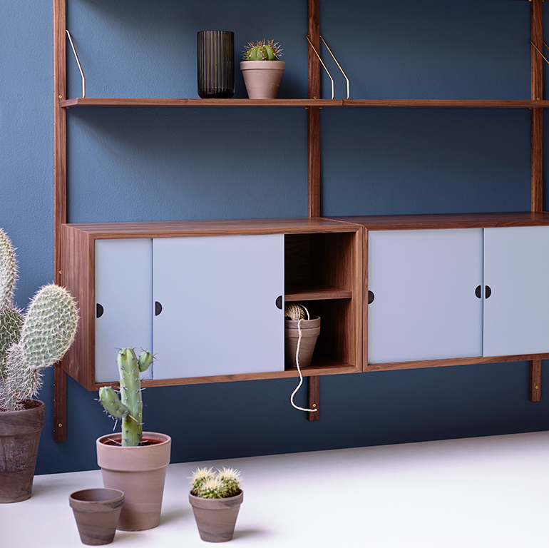 Система хранения, которая строится по модульному принципу. Возможные варианты конфигурации включают в себя полки, рабочий стол и выдвижные ящики. В 1948 году датский архитектор и дизайнер Поуль Кадовиус предложил новаторский подход: крепить стеллаж на стене, за счет чего освобождалось значительное пространство и ощущалась легкость конструкции. Металлические детали выполнены из нержавеющей стали или меди.